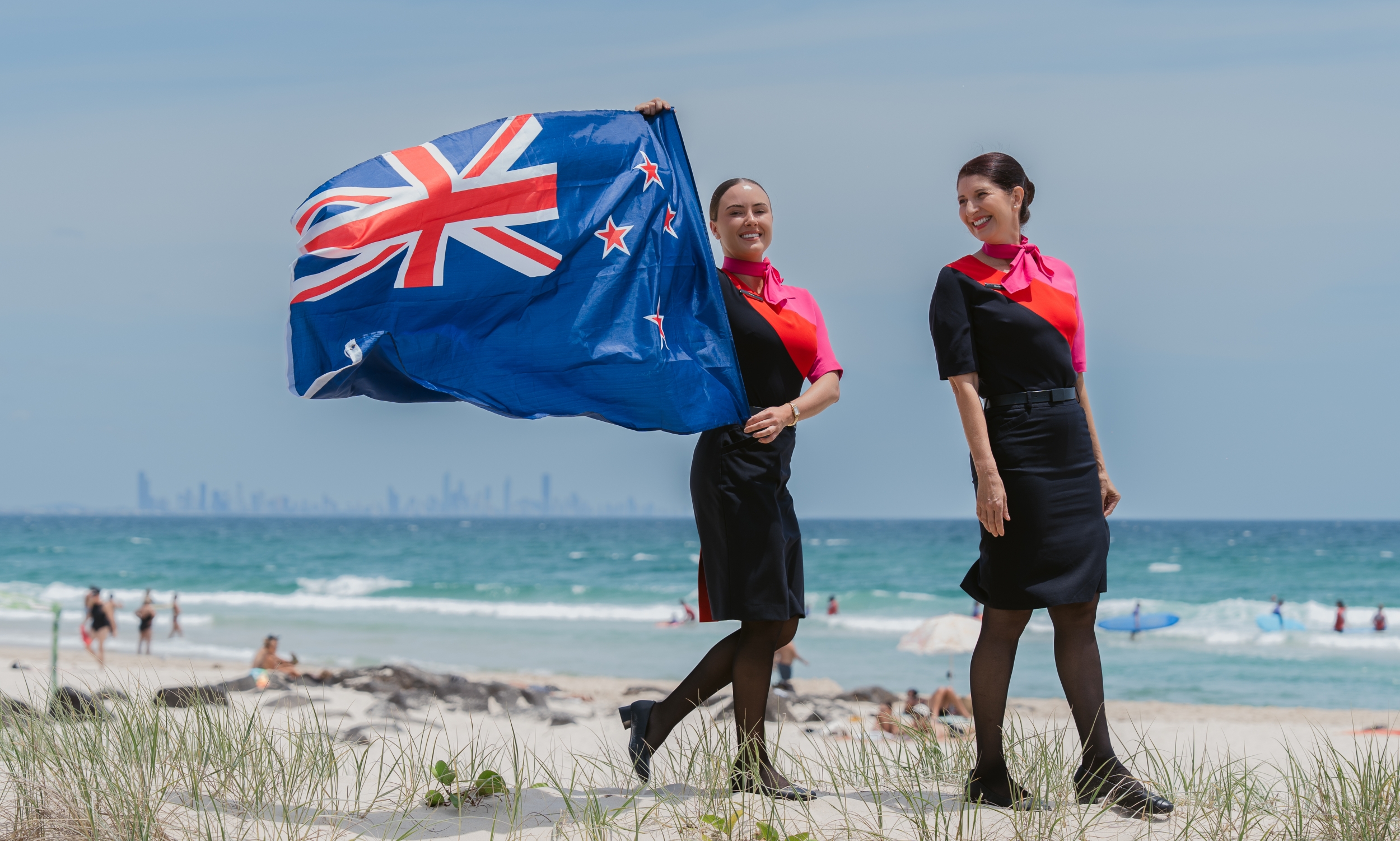 Qantas cabin crew at Kirra Beach with NZ flag (2)